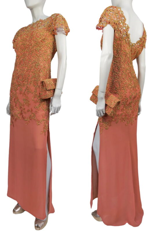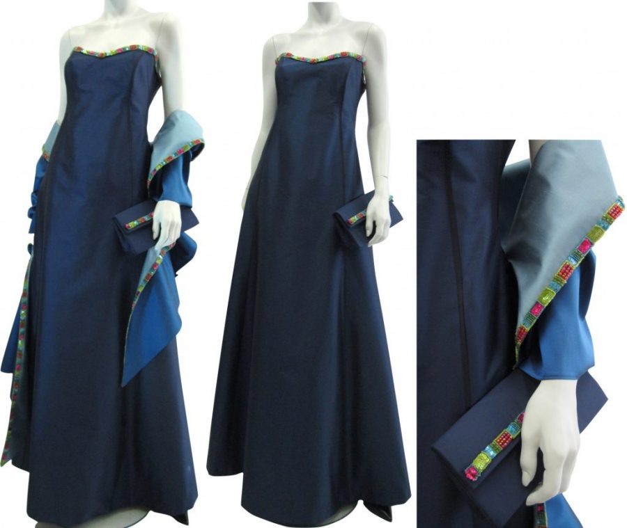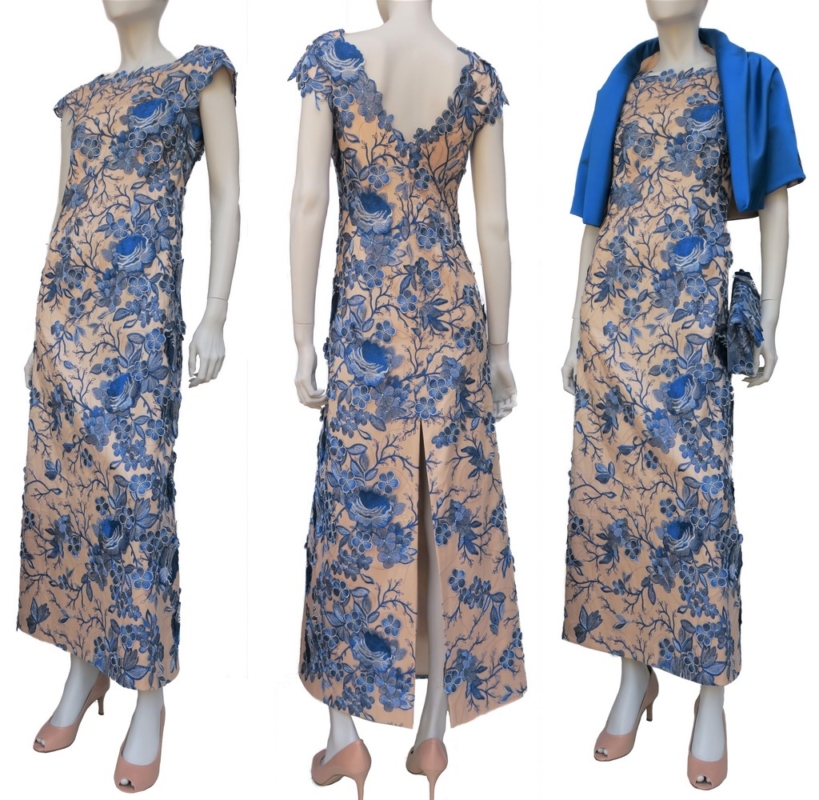 De feestelijke japon, ontworpen voor een bruid, bestaat uit meerdere lagen zijde met geborduurde tule aan de bovenzijde. De tule is zo verwerkt dat het met vloeiende lijnen om het lichaam valt. Iedere takje en bloemetje is met de hand op de onderlaag zijde vast geborduurd. De kleine stola van zuiver zijden satijn met de geborduurde clutch, maken het geheel compleet.