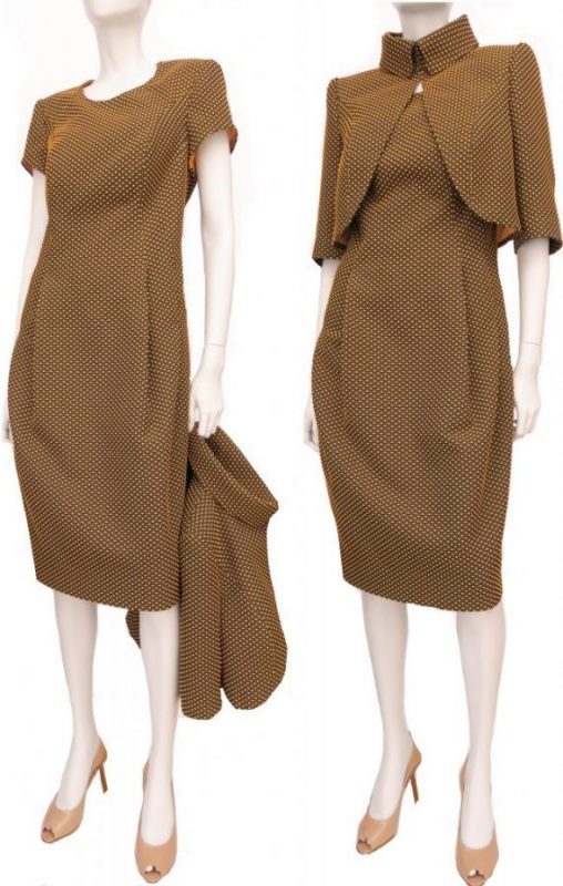 Deze japon is vervaardigd van vederlichte zuiver zijden crepe met een fractie stretch, in een fraaie kleurcombinatie. Uniek en gedurfd maar te allen tijde chique. Het ontwerp is licht getailleerd en heeft een grote sjaalkraag die gesmokt is bij hals en decolleté. De japon heeft vele splitten, waardoor het vederlichte accent nog meer naar voren komt.