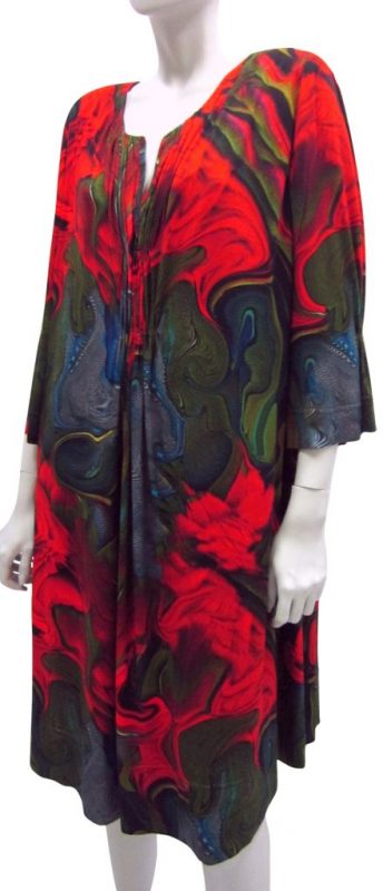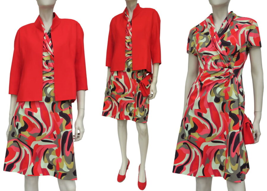 De twee-delige set bestaat uit een felrood jasje van dunne soepele wol, met een vrolijk gedessineerd jurkje in soepel poplin katoen. Het lijkt op een overslagmodel maar is het niet want hij sluit midden-achter met een lange rits. Het ontwerp heeft een geplooide kraag, kapmouwtjes en zakken, waardoor hij ook een sportieve uitstraling krijgt
