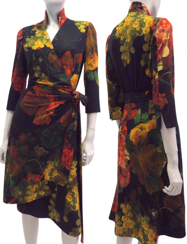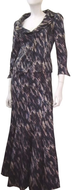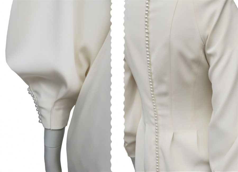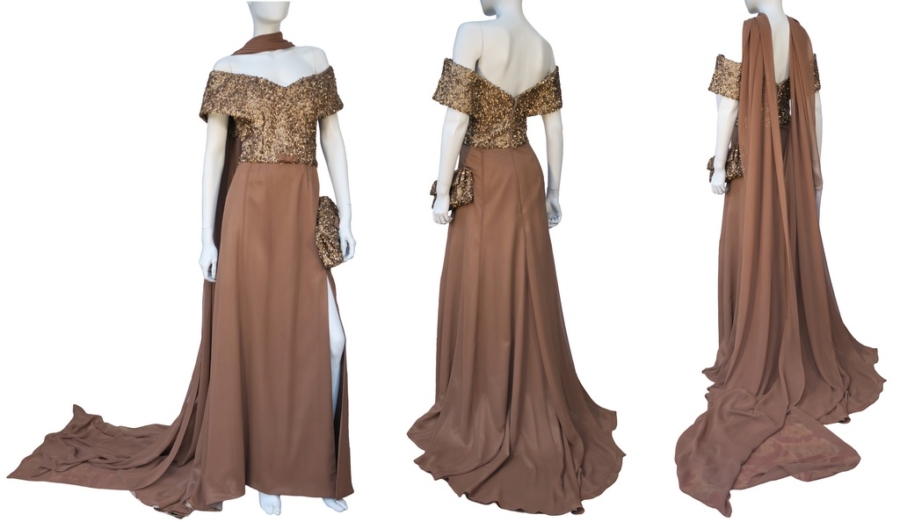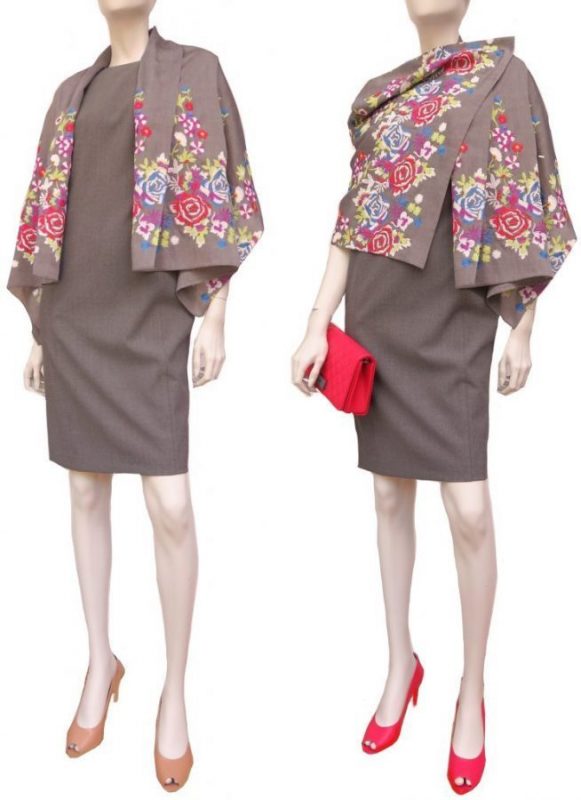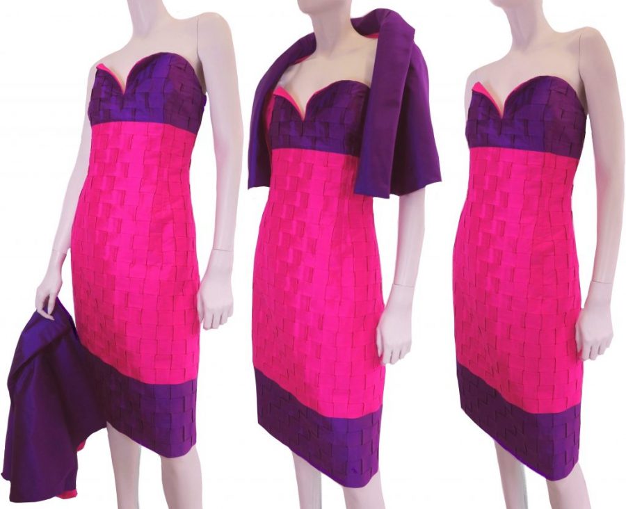 Het cocktail jurkje is vervaardigd van zuiver zijden taft verwerkt met origami technieken. Het ontwerp heeft een A-lijn, is strapless en heeft een omvouwbare splitje bij het decolleté waardoor de andere kleur zijde tevoorschijn gaat komen. Het bolerojasje vervaardigd van dezelfde zijde maar dan zonder de origami techniek, maakt de feestelijke outfit compleet