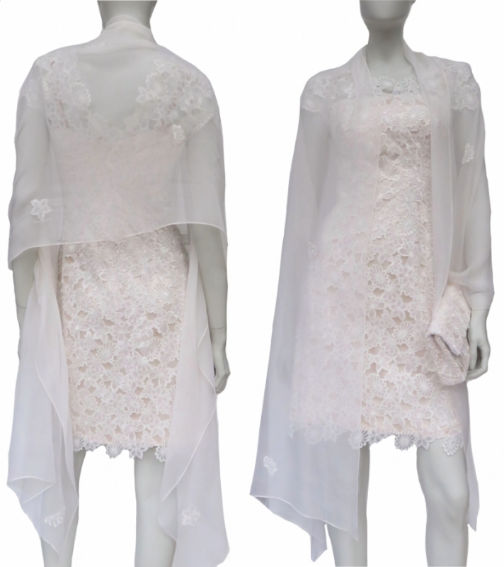 De bruidsjapon voor deze bruid had de opdracht “eenvoudig maar wel met rijke materialen”. Dit resulteerde in een aansluitend en kort jurkje vervaardigd van witte kanten bloemen op zuiver zijden materialen in wit en beige. De bijpassende clutch en transparante zijden sjaal, geborduurd met hier en daar een bloem, maakt de outfit compleet.
