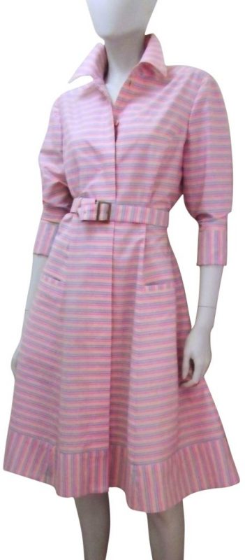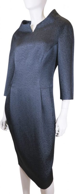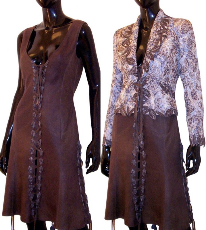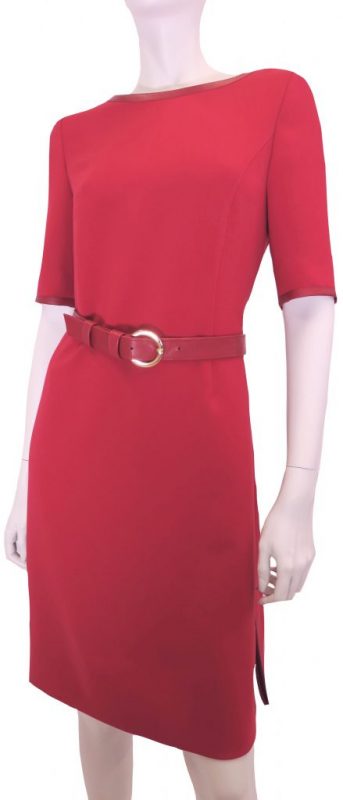 Het jurkje is vervaardigd van comfortabele crêpe met een lichte stretch. Het ontwerp is geheel afgebiesd met lederen biezen in dezelfde kleur rood. De lange zijsplitten, de boothals en de aansluitende korte mouwtjes maken het model tot een zeer draagbaar kledingstuk dat voor alle seizoenen en gelegenheden geschikt is. Ook zonder de ceintuur is de pasvorm perfect.