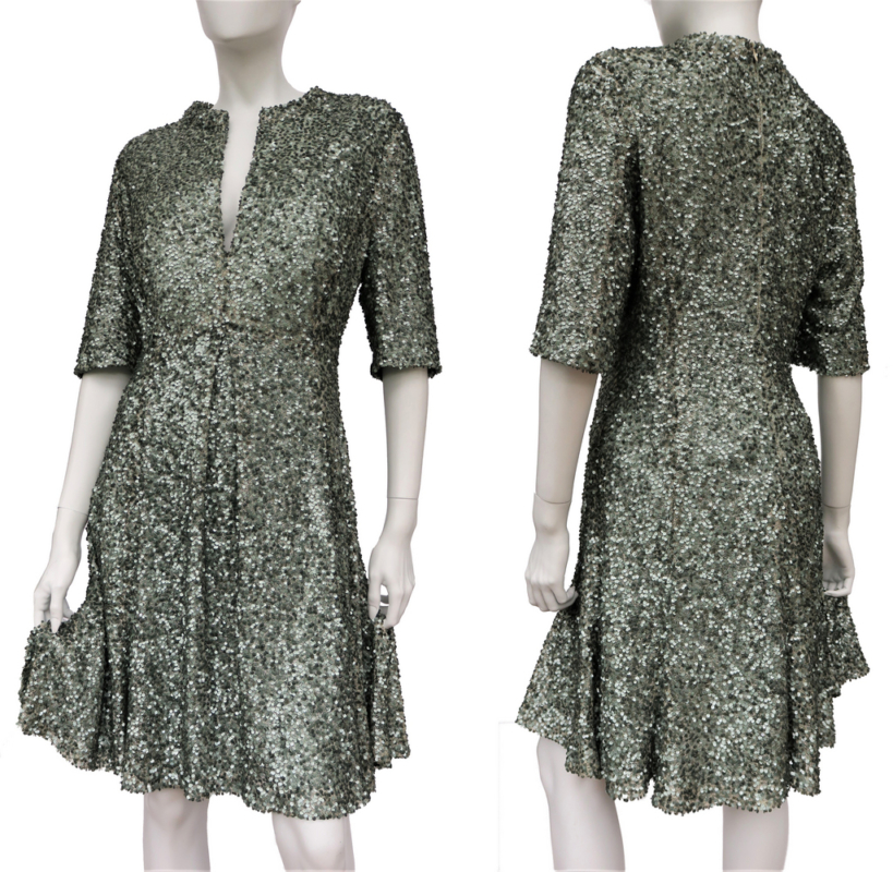 Feesten in pailletjes! Deze zijn zacht en blijven praktisch niet haken wat normaal gesproken bij een paillet wel het geval is. Het ontwerp is geheel met de hand gemaakt omdat de naaimachine alle naalden laat breken. Maar daardoor krijgt de japon wel zijn souplesse, het is boetseren met stof. De binnenkant is van zachte zijden mousseline wat het draagcomfort verhoogt.
